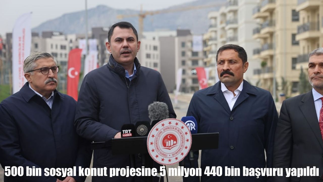 500 bin sosyal konut projesine 5 milyon 440 bin başvuru yapıldığını belirten Bakan Kurum, "Bildiğiniz gibi; Cumhurbaşkanımızın liderliğinde başlattığımız Yüzyılın Konut Projesi ile 500 Bin Sosyal Konut Projemizi hayata geçirdik. Milletimiz de projemize inandı, devletine, hükümetine, liderine güvendi ve 10 Kasım’da başlayan başvurularda şu anda 5 milyon 440 bin sayısına ulaştık. İlk kuraları 29 Aralık’ta çekeceğiz ve evlerimizin yapımına da hızlıca başlayacağız. Tabii proje kapsamında deprem bölgesindeki illerimizi ayrıcalıklı tutarak, bu illerimize daha fazla kontenjan ayırdık. Hatay’ımıza da; Merkez, Antakya ve Defne’de 6800, Hassa’da 1500, İskenderun’da 1354, Reyhanlı’da 750, Kırıkhan’da 600 olmak üzere 15 ilçemizde; tam 13 bin 289 sosyal konutu sunacağız. İnşallah sosyal konutlarımızla da Hatay’ımızda ev sahibi olmayan vatandaşlarımıza huzurlu yuvalar kazandıracağız" dedi