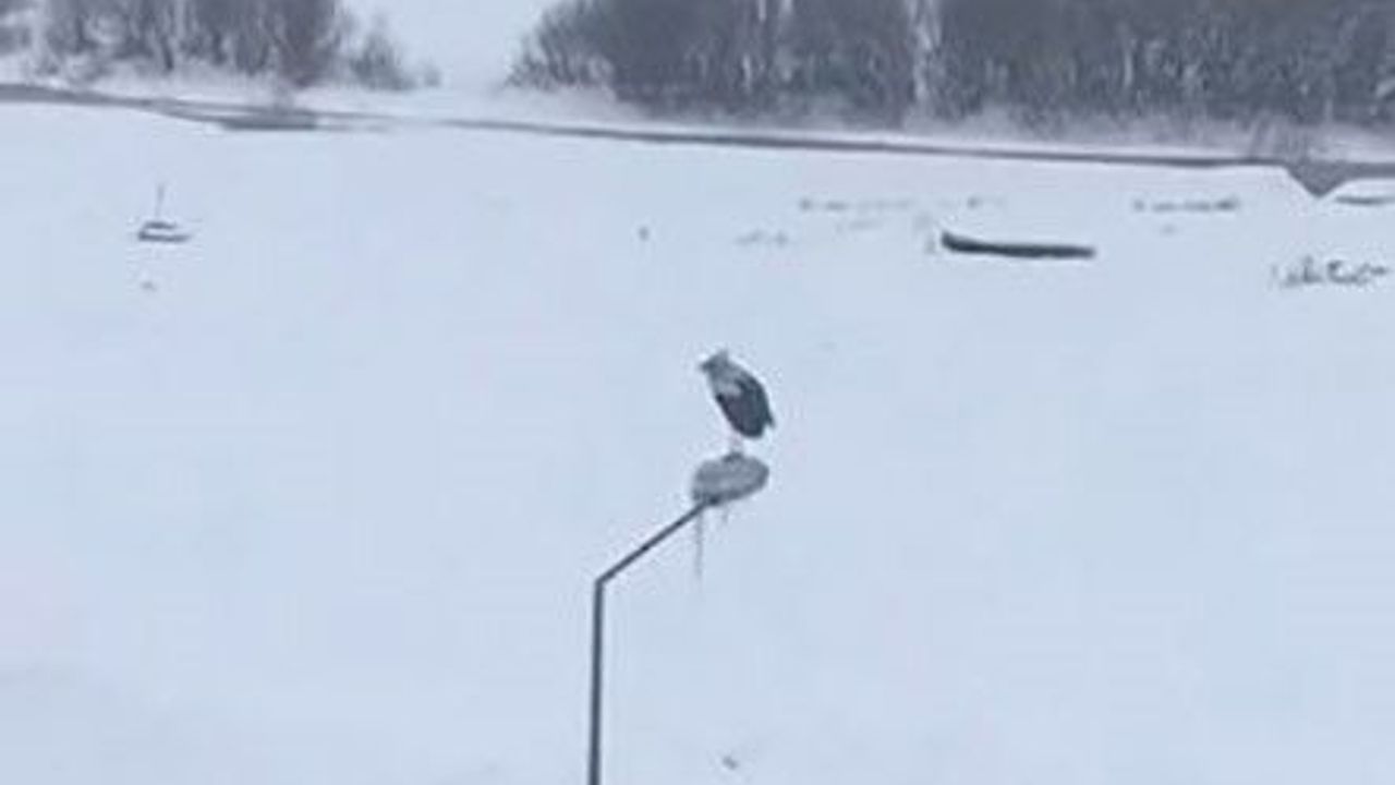 Kar kalınlığının arttığı ve soğuk havanın etkisini sürdürdüğü kentte kaydedilen görüntü, yaban hayatının kış şartlarındaki mücadelesini ortaya koydu. Elektrik direği üzerinde bekleyen leylek, karla kaplı manzara eşliğinde dikkat çekici bir görüntü oluşturdu. Uzun süre çevreyi izleyen kuşun, olumsuz hava koşullarına rağmen bulunduğu noktada kalması görenleri şaşırttı.