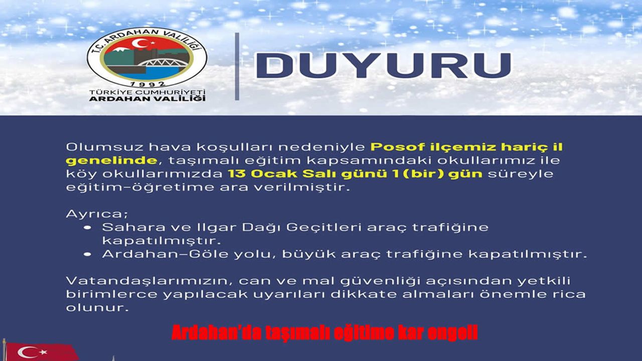 Ardahan Valiliğinden yapılan açıklamada, yoğun kar yağışı ve buzlanma nedeniyle Posof ilçesi dışında kalan tüm ilçelerde taşımalı eğitim kapsamındaki okullar ile köy okullarında 13 Ocak Salı günü eğitim-öğretime 1 gün süreyle ara verildiği bildirildi.
