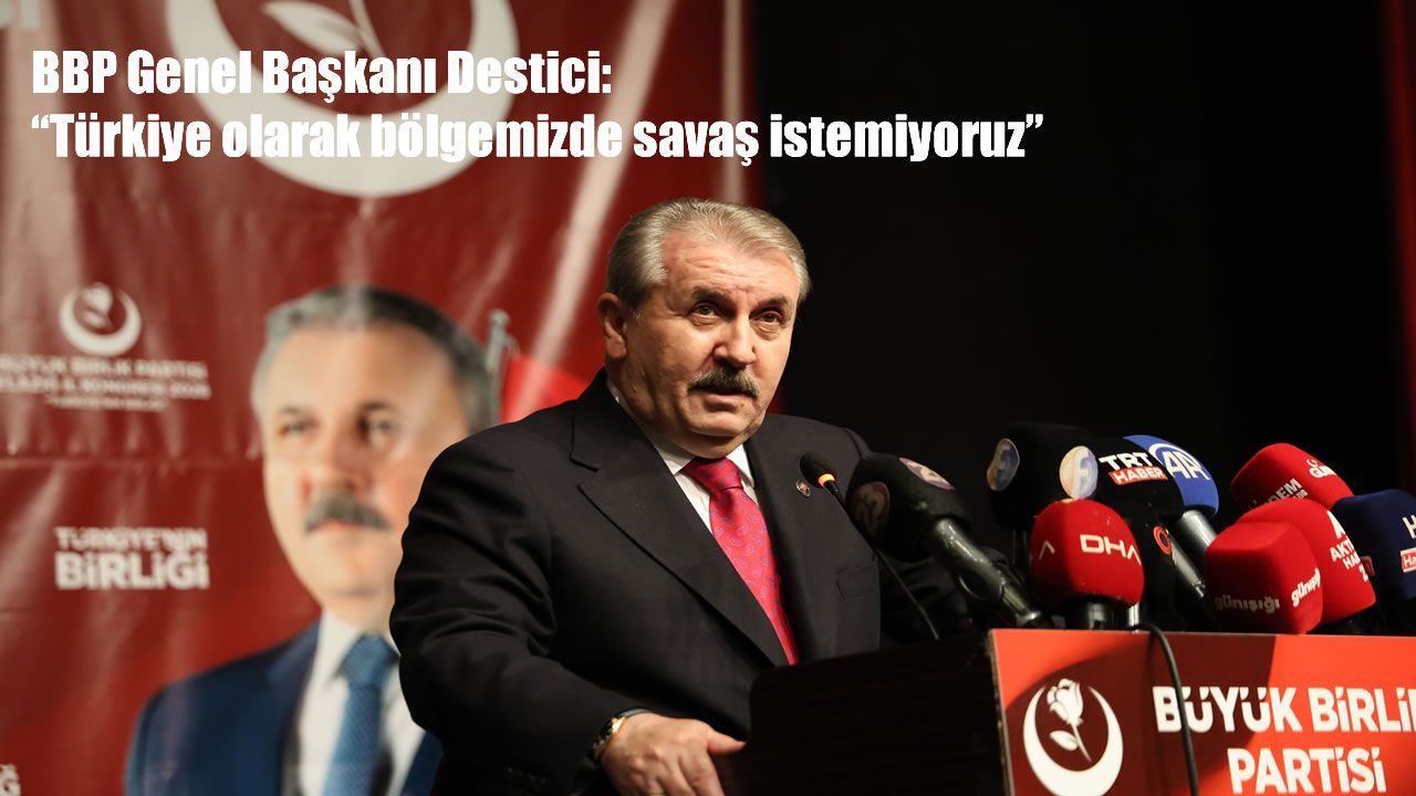 Türk milleti bir olduğunda üstesinden gelemeyeceği bir problemin olmadığının da altını çizen Genel Başkan Destici, "Birliğimizi ve dirliğimizi de kimsenin bozmasına müsaade etmeyeceğiz. Biz Kürt'ü, Türkmen'i, Alevi'si, Sünni'si hep birlikte büyük Türk milletiyiz. Kıyamete kadar da öyle kalacak. Biz Türkiye olarak bölgemizde savaş istemiyoruz. Devletimizin, hükümetimizin ve ittifakımızın attığı bütün adımlar, bu yöndedir. Biz istemiyoruz ama İsrail ve Amerika durmuyor. Dün Afganistan, Irak, Yemen, Libya ve Suriye eğer İran'da da emellerini gerçekleştirirlerse, elbette ki kendilerine engel gördükleri bunun içerisinde Türkiye Cumhuriyeti Devleti de var. Devletleri hedef alacaklar, ülkeleri ve milletleri hedef alacaklar. İran'ı bugün ayakta tutan, füzeleri ve savunma taktikleri kıymetlidir ama İran'ı ayakta tutan ve savaşta şu ana kadar yenilmesini engelleyen milletinin birliğidir. Savaş başlamadan İran'da aylarca süren ayaklanmalar ve gösteriler oldu. İki tarafta da çok kayıplar yaşandı ama Amerika ve İsrail saldırınca İran muhalifiyle ve rejim yanlısıyla bir yumruk gibi oldu ve en son enerji santrallerini ve köprüleri bombalayacağım dediğinde Amerika ve İsrail birer canlı kalkan olarak köprülere ve enerji santrallerine gittiler. Bu ülke bizimdir, yönetimini de biz seçeriz siz karışamazsınız. Rejim değişecekse de biz değiştiririz. Buna Amerika ve İsrail karar veremez dediler. Bugün İran'ı ayakta tutan, İran'ı şu ana kadar İsrail ve ABD karşısında pes ettiremeyen hatta ABD-İsrail'e geri adım attıran İran halkının duruşudur. Bizim de ihtiyacımız budur. Bugüne kadar birliğimizi ve dirliğimizi kimse bozamamıştır. Bundan sonra da bozamayacaktır" şeklinde konuştu.