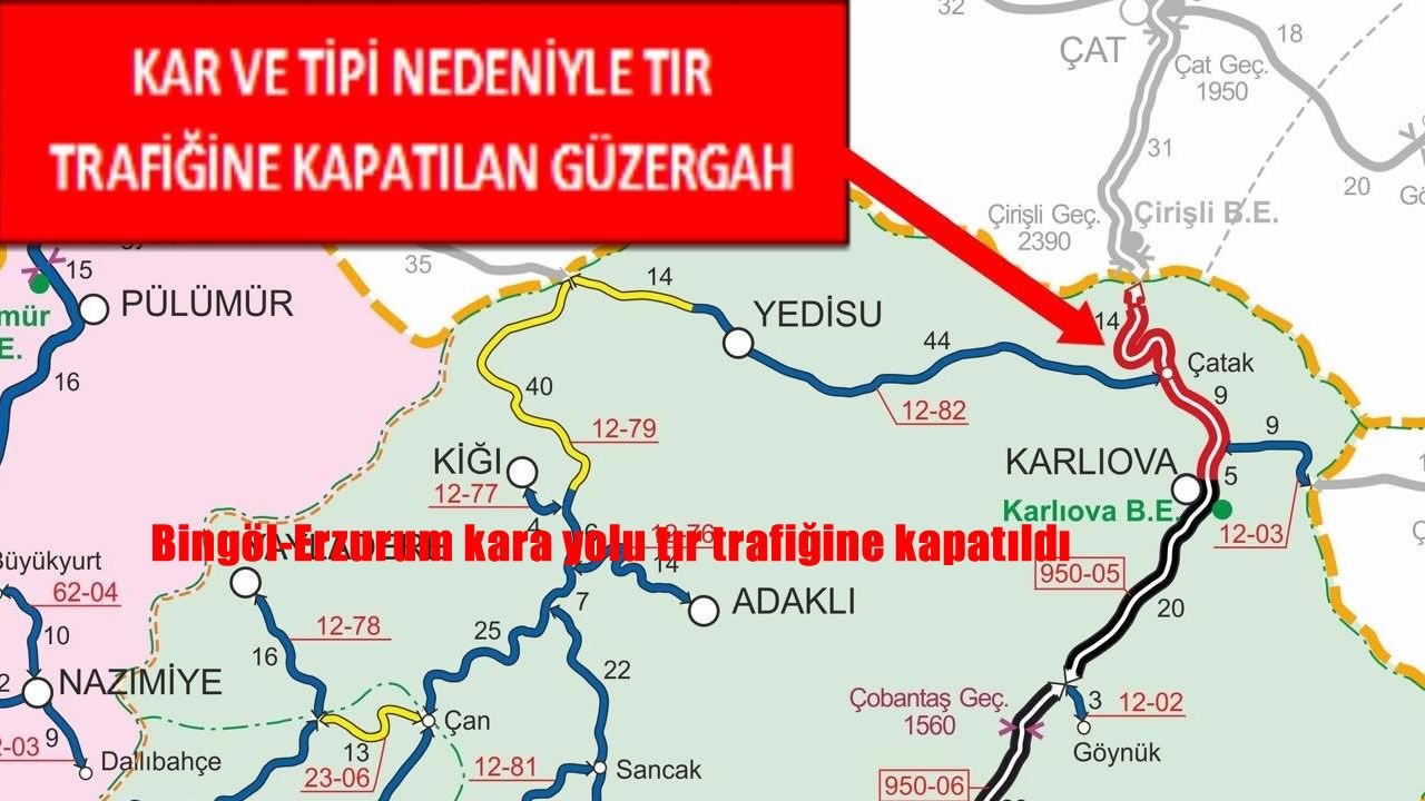 HABER49-Bingöl Valiliğinden yapılan açıklamada; "Bingöl-Erzurum Devlet Yolunun 20-49 km'leri arası yoğun kar yağışı ve tipi nedeniyle saat 10.55 itibari ile TIR trafiğine kapatılmıştır" denildi.