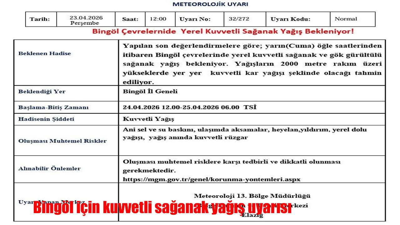 HABER49- Meteoroloji 13. Bölge Müdürlüğü’nden yapılan açıklamada, "Yapılan son değerlendirmelere göre; yarın (Cuma) öğle saatlerinden itibaren Bingöl çevrelerinde yerel kuvvetli sağanak ve gök gürültülü sağanak yağış bekleniyor. Yağışların 2000 metre rakım üzeri yükseklerde yer yer kuvvetli kar yağışı şeklinde olacağı tahmin ediliyor" denildi.