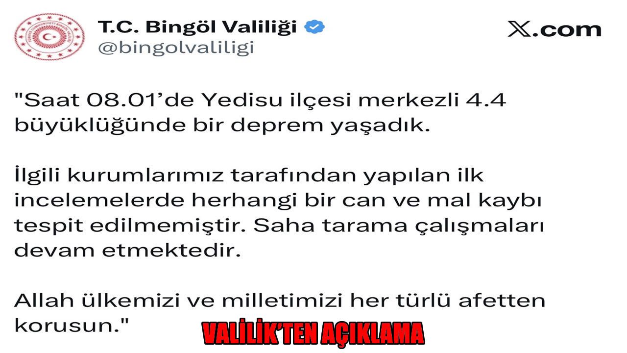 Depremin ardından Bingöl Valiliği’nden yapılan açıklamada, "Saat 08.01’de Yedisu ilçesi merkezli 4.4 büyüklüğünde bir deprem yaşadık. İlgili kurumlarımız tarafından yapılan ilk incelemelerde herhangi bir can ve mal kaybı tespit edilmemiştir. Saha tarama çalışmaları devam etmektedir. Allah ülkemizi ve milletimizi her türlü afetten korusun" denildi.