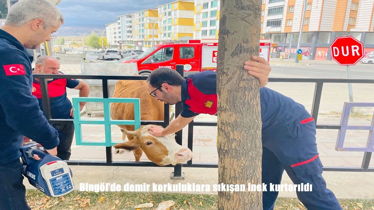 HABER49-Olay, Genç ilçesi Kültür Mahallesi Bingöl Caddesi üzerindeki bir parkta meydana geldi. Sahipli olduğu öğrenilen inek, başını demir korkuluklara sıkıştırınca çevredeki vatandaşlar durumu itfaiyeye bildirdi. İhbar üzerine olay yerine gelen itfaiye ekipleri, hidrolik kesici yardımıyla kısa sürede müdahale ederek ineği zarar vermeden kurtardı. Başarılı bir şekilde tamamlanan kurtarma operasyonunun ardından inek sahibine teslim edildi. Vatandaşlar, özverili çalışmaları nedeniyle itfaiye ekiplerine teşekkür ettiler.