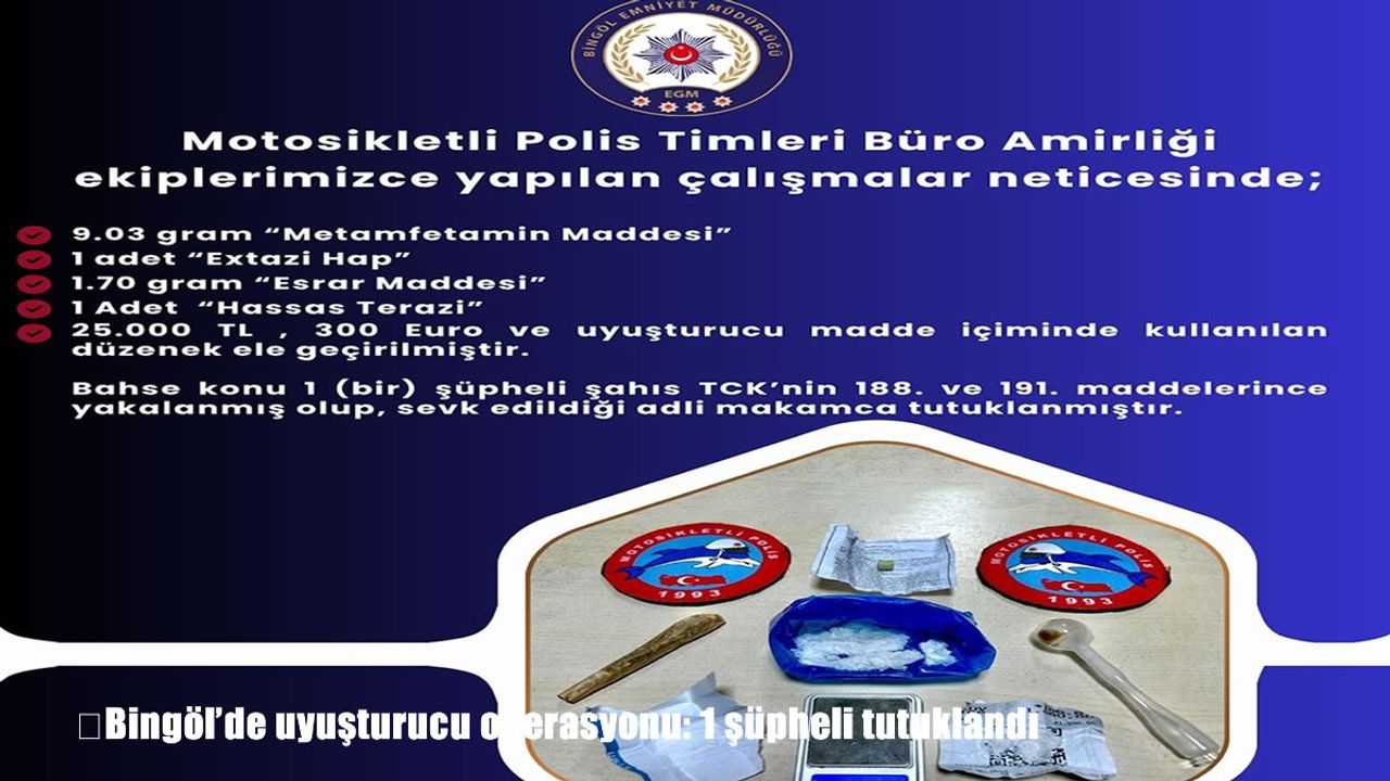 HABER49- Bingöl’de polis ekipleri tarafından yapılan uyuşturucu operasyonunda 1 şüpheli tutuklandı.