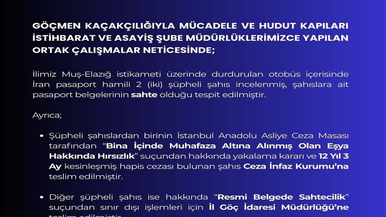 HABER49-Edinilen bilgiye göre, Bingöl İl Emniyet Müdürlüğü ekipleri, göçmen kaçakçılığıyla mücadele kapsamında çalışma yaptı. Çalışmada, Muş-Elazığ istikameti üzerinde durdurulan otobüs içerisinde İran pasaport hamili 2 şahsın pasaport belgelerinin sahte olduğu tespit edildi. Ayrıca şüpheli şahıslardan birinin ‘Bina İçinde Muhafaza Altına Alınmış Olan Eşya Hakkında Hırsızlık’ suçundan hakkında yakalama kararı ve 12 yıl 3 ay kesinleşmiş hapis cezası bulunduğu öğrenildi.
