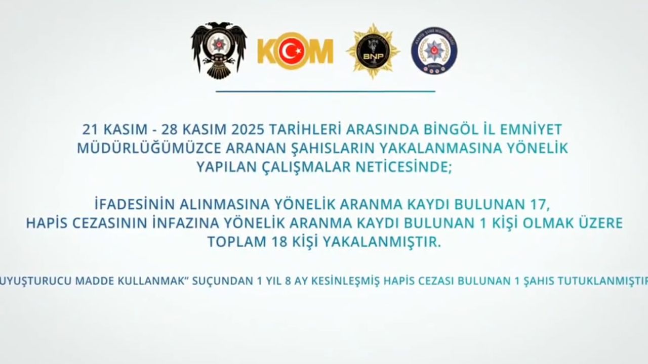 haber49-Bingöl İl Emniyet Müdürlüğü ekipleri, kent genelinde huzur ve güven için çalışmalarını aralıksız sürdürüyor. Bu çerçevede 21-28 Kasım tarihleri arasında yapılan çalışmalarda aranan 18 şüpheli yakalandı. Ayrıca TEM, KOM, Narkotik ve Siber Suçlarla Mücadele ile Asayiş Şube Müdürlükleri tarafından yapılan çalışmalarda 17 şüphelinin yakalandığı bildirildi. Çalışmalarda 8,07 gram kubar esra, 1,55 gram metamfetamin, kaçak sigara ve tütün, 1 adet av tüfeği, 1 adet ruhsatsız tabanca, 1 adet sahte plakalı aracın ele geçirildiği aktarıldı.