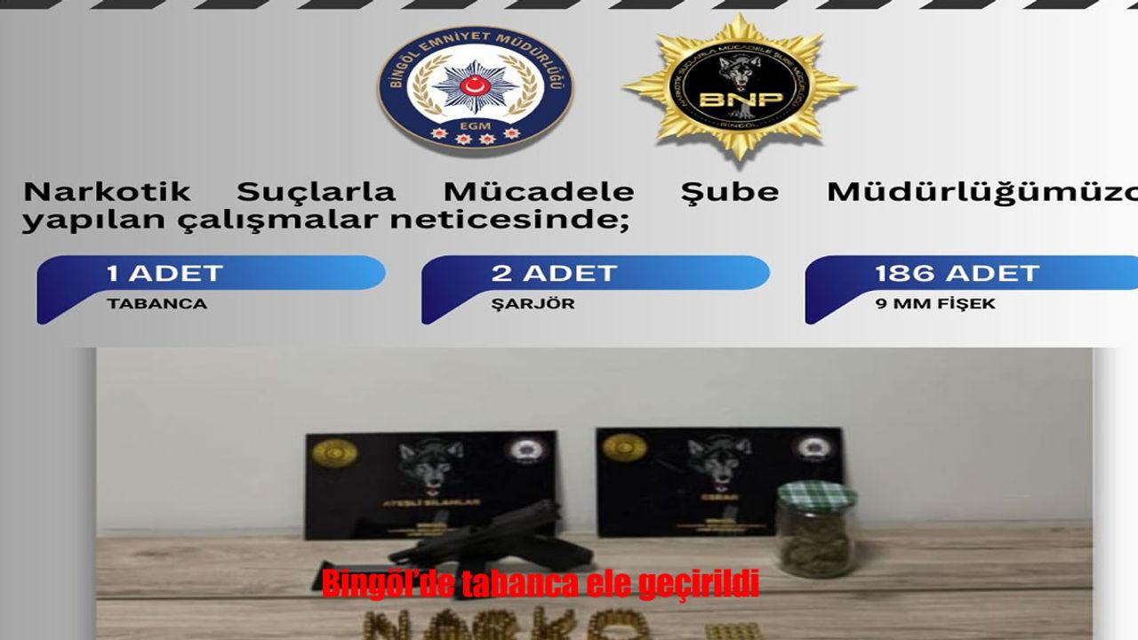 HABER49-Bingöl İl Emniyet Müdürlüğü Narkotik Suçlarla Mücadele Şube Müdürlüğü ekipleri tarafından yapılan çalışmalarda, 1 adet tabanca, 2 adet şarjör ve 186 adet fişek ele geçirildi. Çalışmada, 1 şahıs hakkında 6136 SKM suçundan adli işlem başlatıldığı bildirildi.