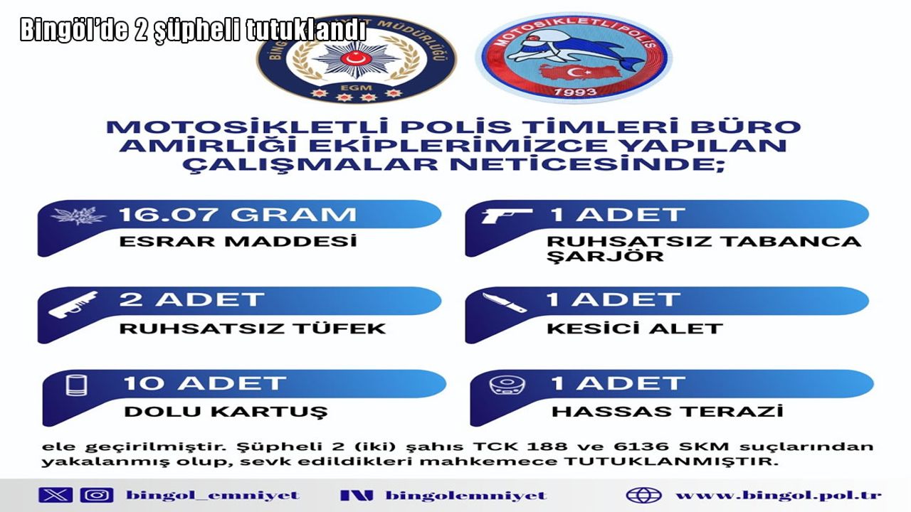 Bingöl İl Emniyet Müdürlüğü, kent genelinde huzur ve güven için çalışmalarına devam ediyor. Bu çerçevede Motosikletli Polis Timleri tarafından yapılan çalışmalarda 16.07 gram esrar maddesi, 1 adet hassas terazi, 1 adet ruhsatsız tabanca, 2 adet ruhsatsız tüfek, 10 adet dolu kartuş ve 1 adet kesici alet ele geçirildi. Ekipler tarafından gözaltına alınan ve işlemlerinin ardından adliyeye sevk edilen 2 şüphelinin, tutuklanarak cezaevine gönderildiği bildirildi.