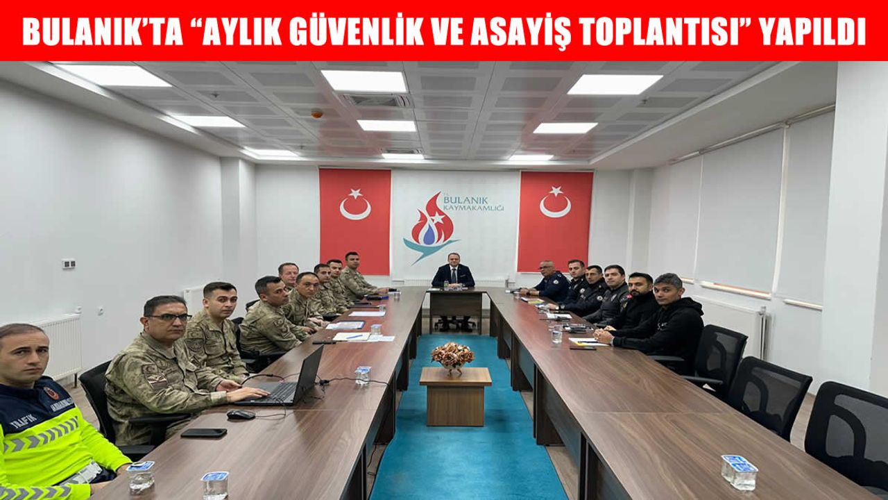 HABER49-Muş’un Bulanık ilçesinde, ilçe genelinde huzur ve güvenliğin sağlanması amacıyla 'Aylık Güvenlik ve Asayiş' toplantısı düzenlendi. Bulanık Kaymakamı Ömer Övünç Koşansu başkanlığında gerçekleştirilen toplantıya, İlçe Emniyet Müdürü Engin Arlı, İlçe Jandarma Komutanı Kazım Tüysüz, karakol komutanları ve ilgili birim amirleri de katıldı.