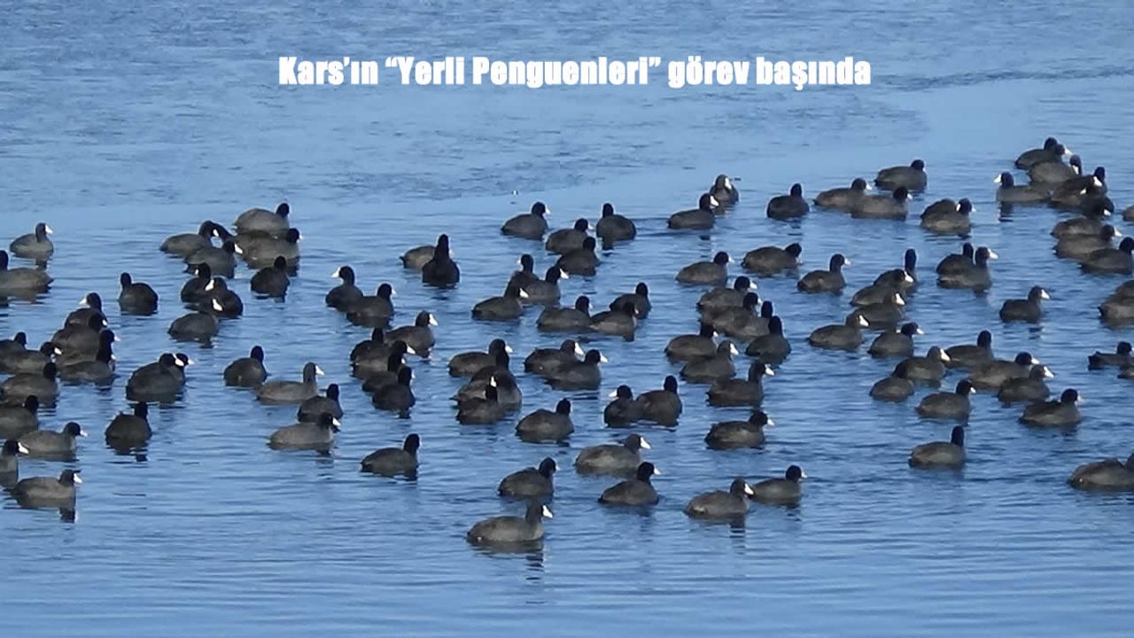 Vatandaşların “Kars pengueni” adını verdiği Sakarmekeler, sert kış şartlarına rağmen bölgeyi terk etmeyerek doğanın direncini gözler önüne serdi. Donan göl yüzeyinde zaman zaman düşe kalka yürüyen kuşlar, buz tutmayan küçük su alanlarında toplanarak daha derin ve güvenli bölgelere ulaşmaya çalıştı.