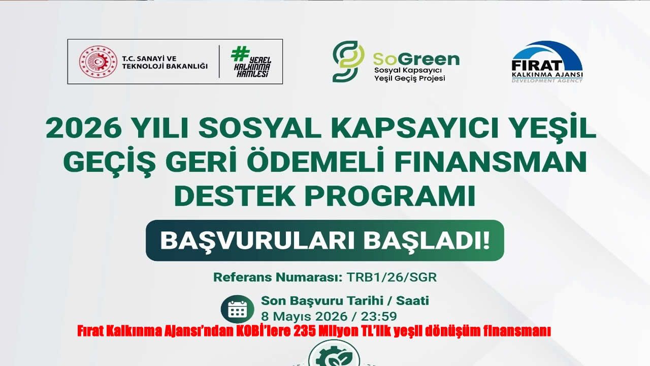 HABER49- Sanayi ve Teknoloji Bakanlığı koordinasyonunda faaliyetlerini sürdüren Fırat Kalkınma Ajansı, 2026 Yılı Sosyal Kapsayıcı Yeşil Geçiş Geri Ödemeli Finansman Destek Programı’nı ilan etti.