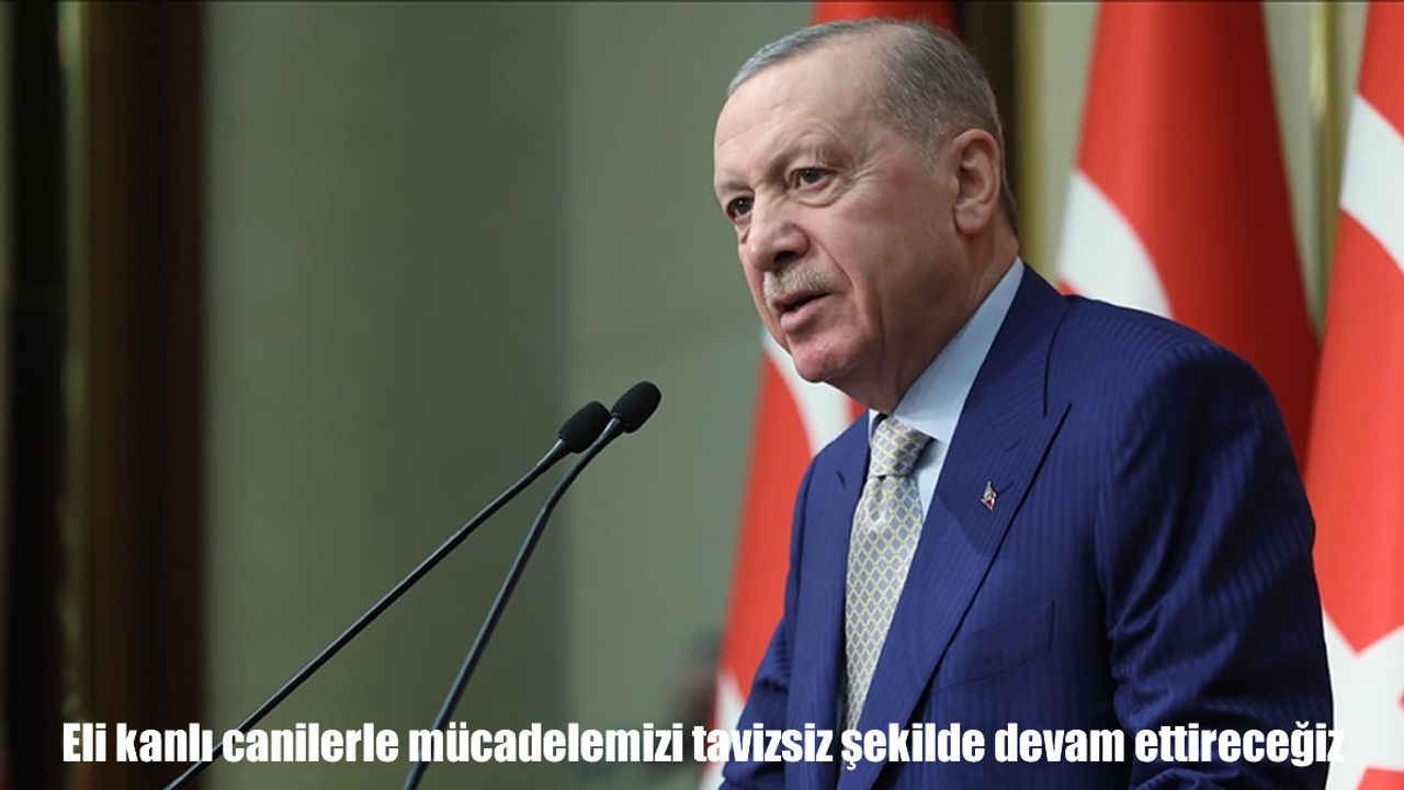 HABER49- Cumhurbaşkanı Recep Tayyip Erdoğan, "Milletimizin huzuruna ve devletimizin güvenliğine kasteden eli kanlı canilerle mücadelemizi, çok boyutlu ve tavizsiz bir şekilde devam ettireceğiz." değerlendirmesinde bulundu.