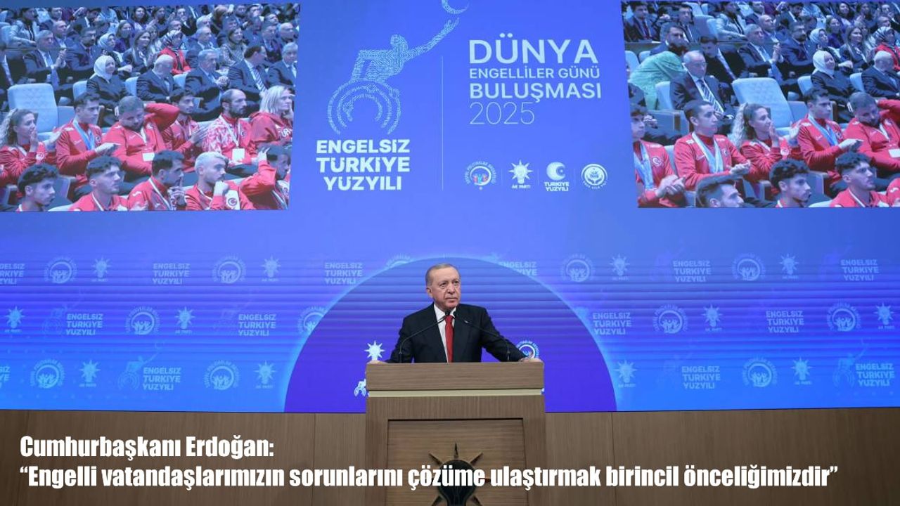 Cumhurbaşkanı Erdoğan, engellilerle ilgili bir müjdeyi paylaşarak, "Biliyorsunuz, 2030 Engelsiz Vizyon Belgesi ile engelli politikalarımızı bütüncül bir stratejiye dönüştürmüş, eğitimden istihdama, teknolojiden afet yönetimine kadar pek çok alanda sürdürülebilir hedefler belirlemiştik. Birinci Engelli Hakları Ulusal Eylem Planımızla bu hedeflerin çok önemli bir kısmına başarıyla ulaştık. 2026-2028 yıllarını kapsayan ikinci eylem planımızın hazırlıklarına başlandı. Detaylarını yakında kamuoyuyla paylaşacağız. Yeni eylem planımız, engelli kardeşlerimiz başta olmak üzere ülkemiz ve milletimiz için şimdiden hayırlı uğurlu olsun diyorum. Buradan hem sizlere hem de farklı platformlar üzerinden bizleri takip eden tüm engelli kardeşlerimize şunu bir kez daha hatırlatmak istiyorum: Sizler bu ülkenin eşit, güçlü ve onurlu vatandaşlarısınız. Sizlerin hayatını kolaylaştırmak, sizlere en yüksek standartlarda hizmet sunmak, sorunlarınızı çözüme ulaştırmak bizim boynumuzun borcudur. Zira devlet bunun için vardır, biz bunun için bu makamlarda bulunuyoruz. Bugüne kadar nasıl sizin yanınızda olduysak, inşallah bundan sonra da en güçlü şekilde size destek vereceğiz, zorlukların üstesinden hep birlikte geleceğiz. Sizlerin yanında olmaya devam edeceğiz. Türkiye Yüzyılı’nı sizlerle birlikte engelsiz Türkiye yüzyılı yapacağız. Tüm engelli kardeşlerimin 3 Aralık Dünya Engelliler Günü’nü bir kez daha tebrik ediyorum. Erişilebilirlik ödüllerine layık görülen kurumlarımı tekrar kutluyor, programa teşrif eden her bir misafirimize kalpten teşekkür ediyorum" ifadelerini kullandı.