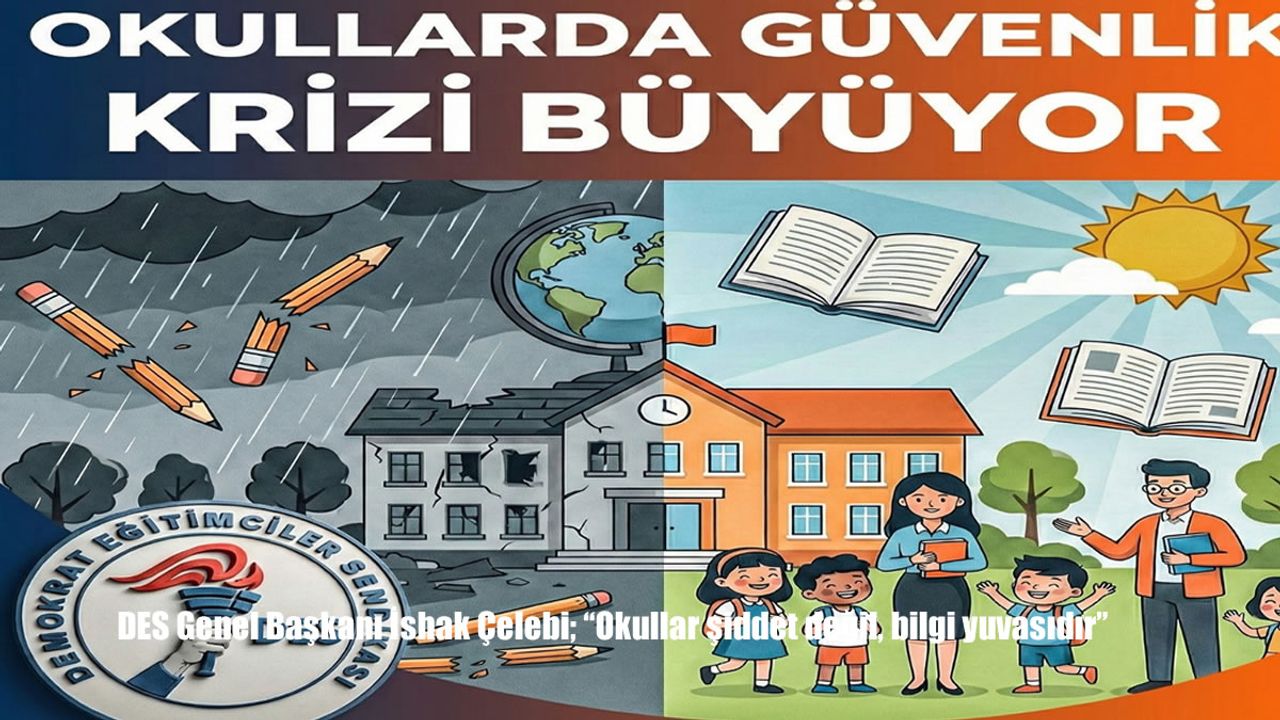 HABER49-Mersin’de bir okulda görev yapan okul müdürünün silahlı saldırı sonucu vurulması üzerine okullarda meydana gelen şiddet olayları üzerine açıklamada bulunan Demokrat Eğitimciler Sendikası (DES) Genel Başkanı İshak Çelebi "Menfur, eğitim camiamız başta olmak üzere tüm vatandaşlarımızı derinden sarsmış; okullarımızın ne denli güvensiz hale getirildiğini bir kez daha acı biçimde gözler önüne sermiştir" dedi.