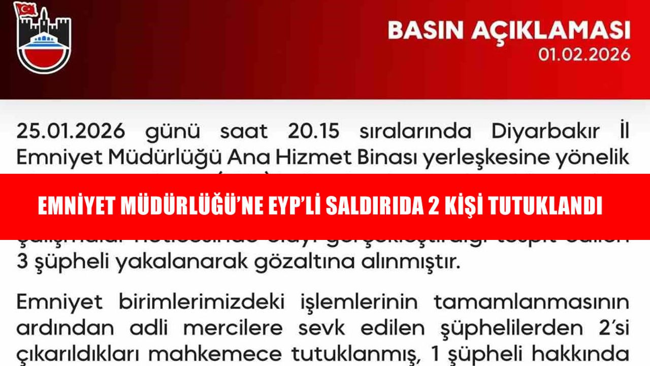 HABER49-Diyarbakır Valiliğinden yapılan açıklamada, 25 Ocak 2026 günü saat 20.15 sıralarında Diyarbakır il Emniyet Müdürlüğü ana hizmet binası yerleşkesine yönelik el yapımı patlayıcı (EYP) kullanılarak gerçekleştirilen saldırı girişimiyle ilgili olarak güvenlik birimlerince yürütülen çalışmalar neticesinde olayı gerçekleştirdiği tespit edilen 3 şüphelinin gözaltına alındığı belirtildi. Açıklamada, "Emniyet birimlerimizdeki işlemlerinin tamamlanmasının ardından adli mercilere sevk edilen şüphelilerden 2’si çıkarıldıkları mahkemece tutuklanmış, 1 şüpheli hakkında ise adli kontrol hükümleri uygulanmıştır. Vatandaşlarımızın huzur ve güvenliğini hedef alan hiçbir girişime müsamaha gösterilmeyecek kamu düzeninin korunması ve toplum güvenliğinin sağlanması amacıyla tüm tedbirler kararlılıkla uygulanmaya devam edilecektir’’ denildi.