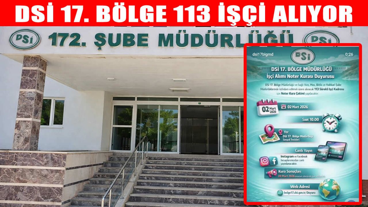 DSİ 17. Bölge Müdürlüğü ve bağlı şube müdürlüklerinde görevlendirilmek üzere yapılacak personel alımı için noter huzurunda kura çekimi düzenlenecek. 2 Mart 2026 Pazartesi günü saat 10.00’da başlayacak olan çekiliş, DSİ 17. Bölge Müdürlüğü Sosyal Tesisleri’nde yapılacak.