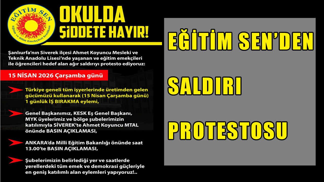 Eğitim ve Bilim Emekçileri Sendikası (Eğitim Sen), Şanlıurfa’nın Siverek ilçesindeki Ahmet Koyuncu Mesleki ve Teknik Anadolu Lisesi’nde yaşanan ve eğitim emekçileri ile öğrencileri hedef alan silahlı saldırıyı protesto etmek amacıyla 15 Nisan Çarşamba günü (yarın) Türkiye genelinde bir günlük iş bırakma eylemi yapacağını duyurdu.