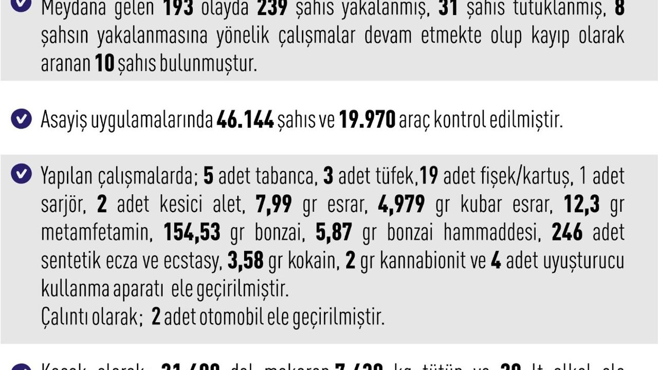 Kaçakçılık kapsamında ise 2 çalıntı otomobil ele geçirilirken, 21 bin 600 dal kaçak makaron, 7 bin 430 kilo tütün ve 20 litre kaçak alkol de yetkililerce toplandı. Yapılan açıklamada, asayiş uygulamalarının kentte suç oranlarını azaltmak ve halkın güvenliğini sağlamak için kararlılıkla sürdürüleceği vurgulandı. Ekipler, özellikle uyuşturucu ve kaçak ürün ticaretiyle mücadelede etkinliğin artırılacağını belirtti.