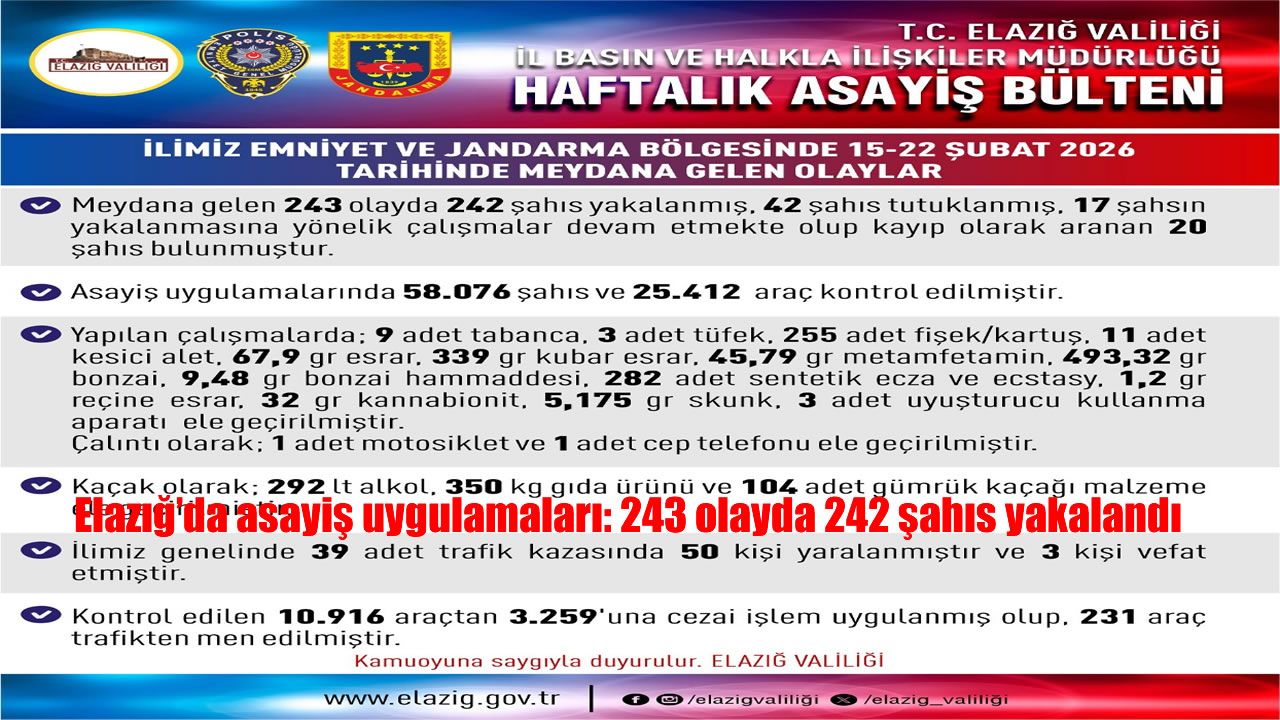 HABER49- Elazığ Valiliği, 15-22 Şubat 2026 tarihlerini kapsayan haftalık asayiş bültenini yayımladı. Bültende yer alan bilgilere göre, kent genelinde meydana gelen 243 olayda 242 şahıs yakalandı, 42 kişi de tutuklandı. Çalışmalarda 58 bin 76 şahıs ve 25 bin 412 araç denetlendi. Kontrol edilen araçlardan, 3 bin 259’una cezai işlem uygulanırken 231 araç da trafikten men edildi. Kent genelinde meydana gelen 39 adet trafik kazasında 51 kişi yaralanırken 3 kişi de hayatını kaybetti.