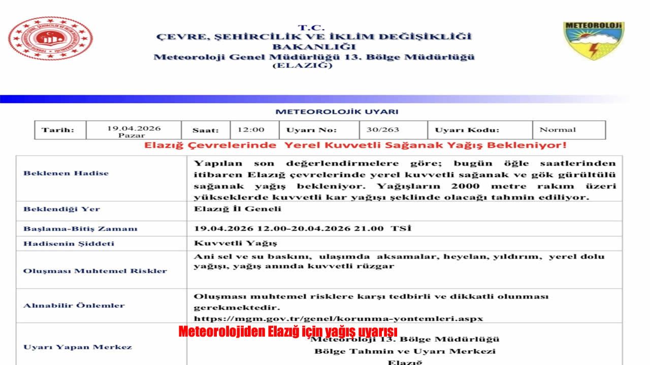 Meteoroloji 13. Bölge Müdürlüğü tarafından yapılan uyarıda, "Yapılan son değerlendirmelere göre; bugün öğle saatlerinden itibaren Elazığ çevrelerinde yerel kuvvetli sağanak ve gök gürültülü sağanak yağış bekleniyor. Yağışların 2000 metre rakım üzeri yükseklerde kuvvetli kar yağışı şeklinde olacağı tahmin ediliyor. Oluşması muhtemel risklere karşı tedbirli ve dikkatli olunması gerekmektedir" denildi.