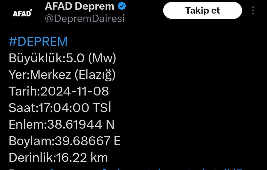 AFAD 5,0 büyüklüğünde yaşanan deprem merkezinin Elazığ olduğunu duyurdu.