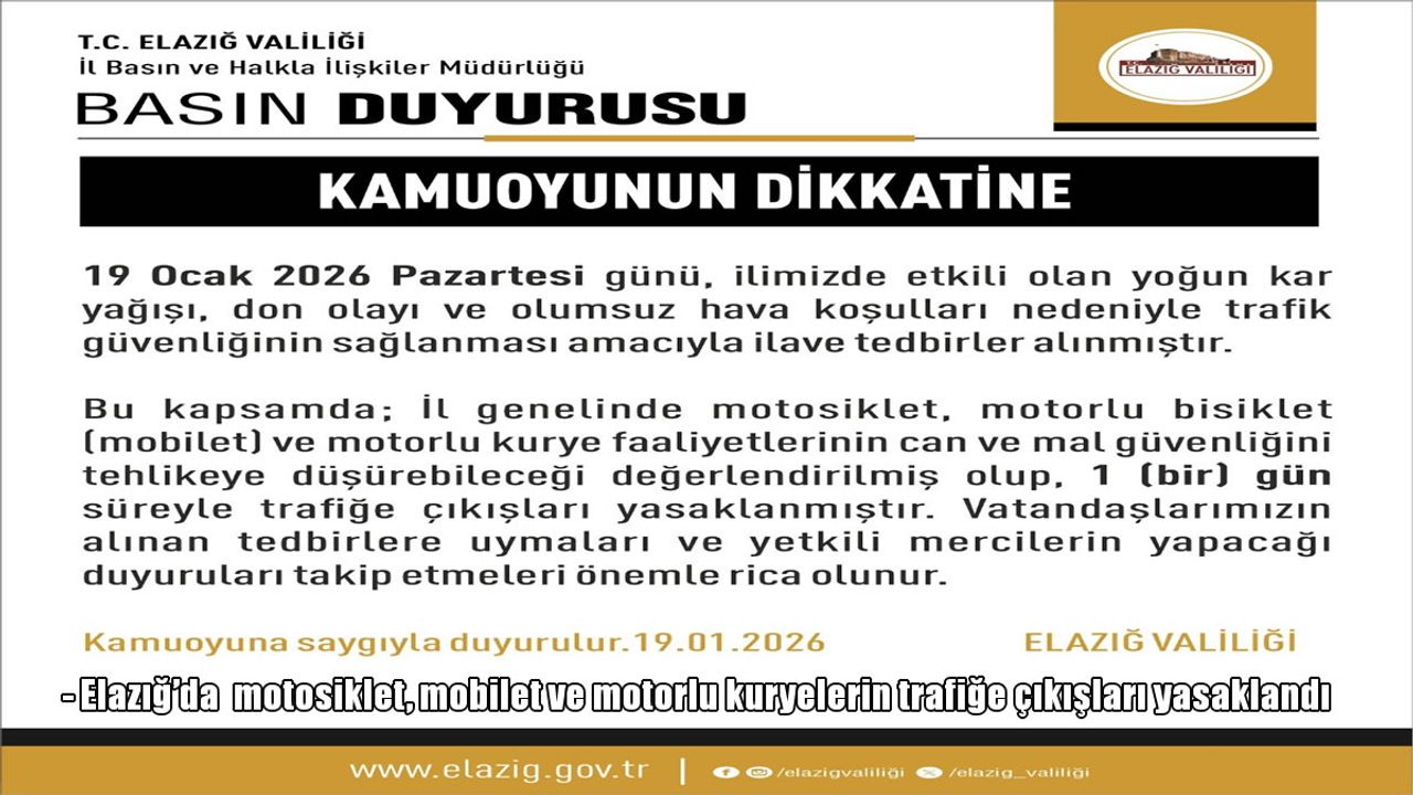 HABER49- Elazığ Valiliği’nden yapılan açıklamada, "19 Ocak 2026 Pazartesi günü, ilimizde etkili olan yoğun kar yağışı, don olayı ve olumsuz hava koşulları nedeniyle trafik güvenliğinin sağlanması amacıyla ilave tedbirler alınmıştır. Bu kapsamda; İl genelinde motosiklet, motorlu bisiklet (mobilet) ve motorlu kurye faaliyetlerinin can ve mal güvenliğini tehlikeye düşürebileceği değerlendirilmiş olup, 1 (bir) gün süreyle trafiğe çıkışları yasaklanmıştır. Vatandaşlarımızın alınan tedbirlere uymaları ve yetkili mercilerin yapacağı duyuruları takip etmeleri önemle rica olunur" denildi.