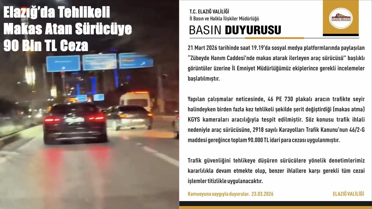Elazığ Valiliği tarafından yapılan açıklamada, sürücüye 2918 sayılı Karayolları Trafik Kanunu’nun 46/2-G maddesi uyarınca toplam 90 bin TL idari para cezası uygulandığı belirtildi. Valilik ayrıca, trafik güvenliğini tehlikeye düşüren sürücülere yönelik denetimlerin kararlılıkla süreceğini ve benzer ihlallerde cezai işlemlerin titizlikle uygulanacağını duyurdu.