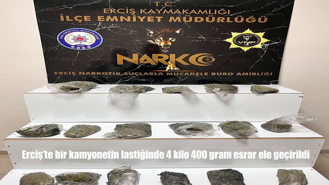 HABER49-Erciş İlçe Emniyet Müdürlüğü'ne bağlı Narkotik Suçlarla Mücadele Büro Amirliği ekiplerince kapalı kasa hafif ticari kamyonette narkotik köpeği ile arama yapıldı. Yapılan aramada sağ arka lastiğe gizlenmiş 4 kilo 400 gram esrar ele geçirilirken, olayla ilgili 3 şüpheli gözaltına alındı. Erciş Cumhuriyet Savcısı talimatıyla gözaltına alınan 3 şüpheli çıkarıldıkları adli makamlarca tutuklandı.