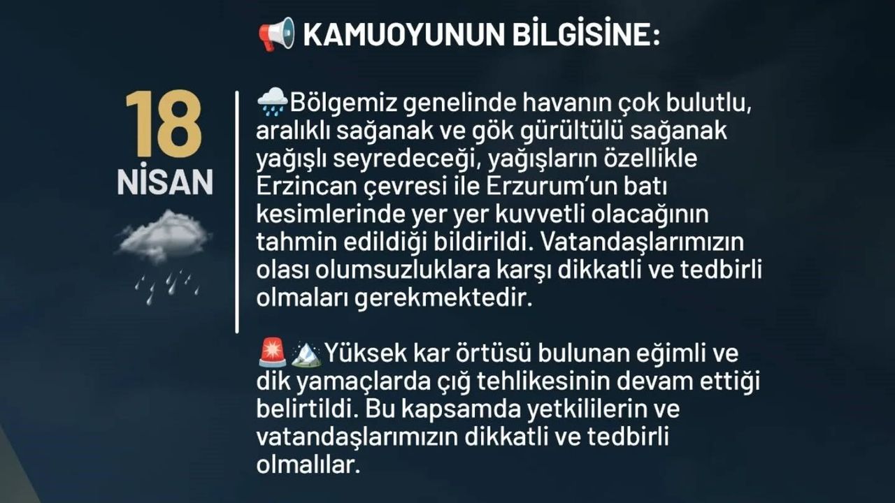HABER49-Bölge genelinde sağanak ve gök gürültülü yağışların görüleceği, Erzincan çevresi ile Erzurum’un batısında yağışların yer yer kuvvetli olacağı bildirildi.
