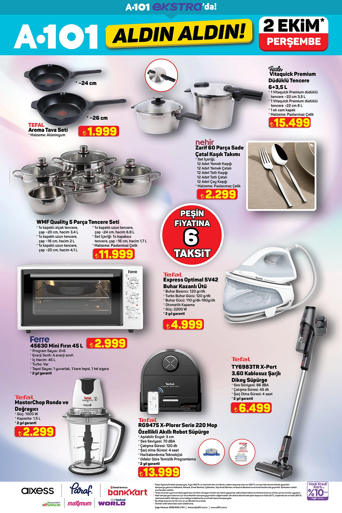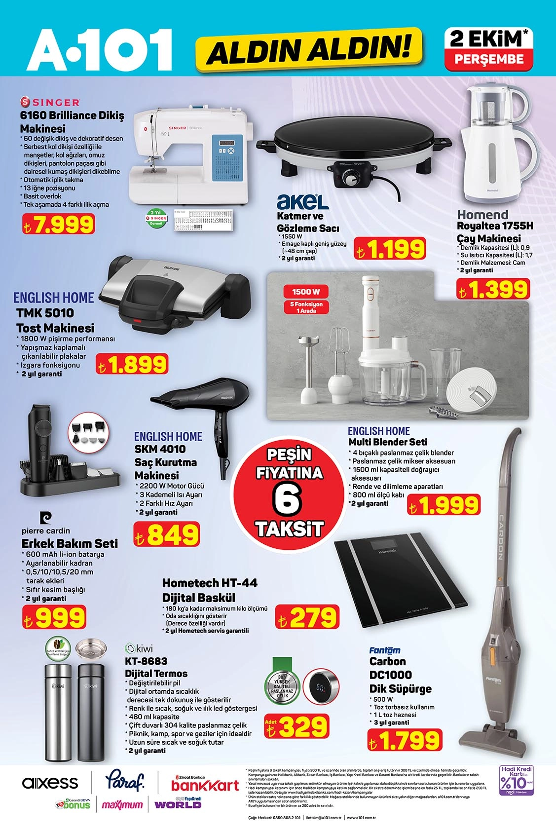 A101’in 2 Ekim aktüel kataloğu, ev ve kişisel kullanım ürünlerinde büyük fırsatlar sunuyor. Bu hafta öne çıkan ürünler arasında Brilliance Dikiş Makinesi, Katmer ve Gözleme Sacı, Tost Makinesi, Dijital Termos, Multi Blender Seti ve Saç Kurutma Makinesi bulunuyor. Katalog, hem mağazalarda hem de online alışveriş platformunda geçerli olup tüketicilere geniş bir seçenek yelpazesi sunuyor. Özellikle ev aletleri, kullanım kolaylığı ve fiyat avantajlarıyla alışveriş tutkunlarının ilgisini çekiyor.