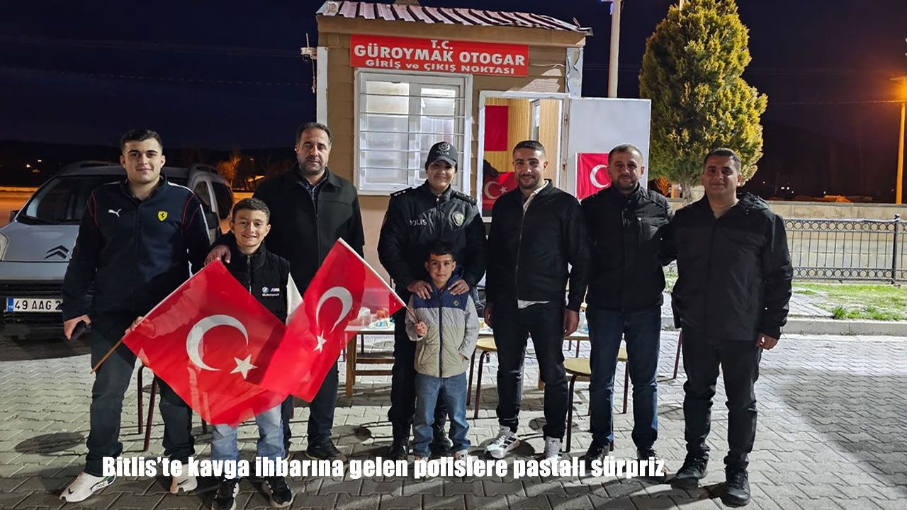 HABER49- Güroymak Şehirler Arası Otobüs Terminali'nde yazıhane işletmeciliği yapan Şenol Gez, ilçede görev yapan polis ekipleri için sürpriz bir organizasyon düzenledi. Otogarda kavga olduğunu ihbar eden Gez, gelen polisleri ellerinde Türk bayrakları bulunan çocuklarla birlikte karşıladı.