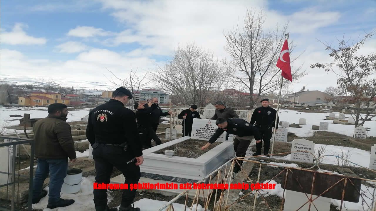 HABER49- Erzurum'un Hınıs ilçesinde polis ekipleri şehit kabirlerini tek tek temizleyip bakımdan geçirdi. Hınıs İlçe Emniyet Müdürlüğü personeli sorumluluk bölgelerindeki şehitlere ait 3 kabristanın bakımı ve temizliğini yaparak şehitlerimizin aziz hatırasına sahip çıktı. Etkinlik kapsamında ayrıca Şehit Jandarma Komando Er Osman Bağ'ın kabristanındaki değiştirilen bayrak, annesi Gülbahar Bağ'a teslim edilerek hayır duası alındı.