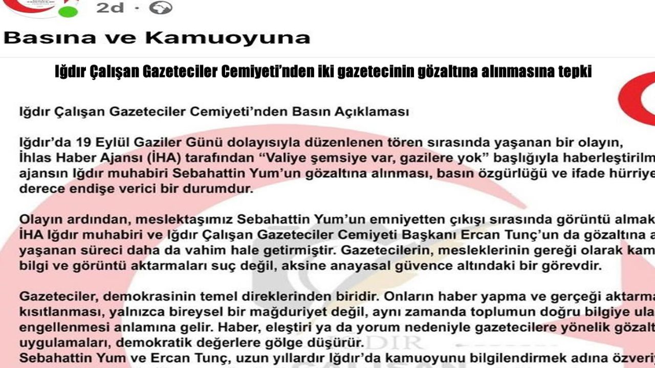 HABER49-Iğdır Çalışan Gazeteciler Cemiyetinden yapılan açıklamada, "Iğdır'da 19 Eylül Gaziler Günü dolayısıyla düzenlenen tören sırasında yaşanan bir olayın, İhlas Haber Ajansı (İHA) tarafından "Valiye şemsiye var, gazilere yok" başlığıyla haberleştirilmesinin ardından, ajansın Iğdır muhabiri Sebahattin Yum'un gözaltına alınması, basın özgürlüğü ve ifade hürriyeti açısından son derece endişe verici bir durumdur. Olayın ardından, meslektaşımız Sebahattin Yum'un emniyetten çıkışı sırasında görüntü almak isteyen İHA Iğdır muhabiri ve Iğdır Çalışan Gazeteciler Cemiyeti Başkanı Ercan Tunç'un da gözaltına alınması, yaşanan süreci daha da vahim hale getirmiştir. Gazetecilerin, mesleklerinin gereği olarak kamuoyuna bilgi ve görüntü aktarmaları suç değil, aksine anayasal güvence altındaki bir görevdir. Gazeteciler, demokrasinin temel direklerinden biridir. Onların haber yapma ve gerçeği aktarma haklarının kısıtlanması, yalnızca bireysel bir mağduriyet değil, aynı zamanda toplumun doğru bilgiye ulaşma hakkının da engellenmesi anlamına gelir. Haber, eleştiri ya da yorum nedeniyle gazetecilere yönelik gözaltı ve baskı uygulamaları, demokratik değerlere gölge düşürür. Sebahattin Yum ve Ercan Tunç, uzun yıllardır Iğdır'da kamuoyunu bilgilendirmek adına özveriyle çalışan, meslek ilkelerine bağlı gazetecilerdir. Her iki meslektaşımızın da görevlerini yaparken yaşadıkları bu süreç, basın özgürlüğü açısından kaygı vericidir. Iğdır Çalışan Gazeteciler Cemiyeti olarak, meslektaşlarımız Sebahattin Yum ve Ercan Tunç'un yanında olduğumuzu, olayın tüm yönleriyle açıklığa kavuşturulmasını ve benzer durumların bir daha yaşanmaması için gerekli adımların atılmasını talep ediyoruz. Basın özgürlüğü; demokrasinin, şeffaf yönetimin ve toplumsal adaletin en temel güvencelerinden biridir. Gazetecilerin özgürce çalışabildiği bir ortam, güçlü bir toplumun da ön koşuludur. Kamuoyuna saygıyla duyurulur." denildi.