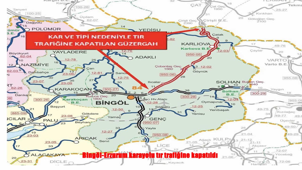 Bingöl Valiliği tarafından yapılan açıklamada, Bingöl-Erzurum Devlet Yolunun Kervansaray Kavşağı ile Bingöl-Erzurum il sınırı arasındaki 0-88 kilometrelik bölümünün, yoğun kar yağışı ve tipi sebebiyle saat 15.55 itibarıyla tır geçişlerine kapatıldığı bildirildi.