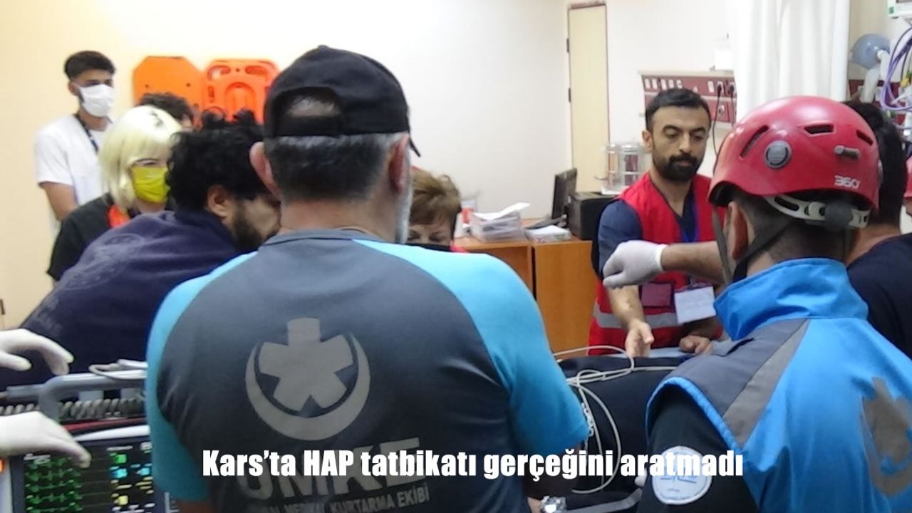 HABER49-Sağlık Araştırma ve Uygulama Hastanesi'nde senaryo gereği Selim ilçesi merkezli 6.8 büyüklüğünde meydana gelen depremin ardından Hastane Afet Planı (HAP) uygulandı. Tatbikat senaryosuna göre deprem sonrası enkaz altından çıkarılan 57 yaralıdan 12'si Sağlık Araştırma ve Uygulama Hastanesi'ne sevk edildi. Tatbikatta 112 Acil Komuta ve Kontrol Merkezi koordinasyonunda sağlık ekipleri, UMKE, polis, AFAD ve hastane personelinden oluşan yaklaşık 100 görevli yer aldı. Gerçeği aratmayan tatbikatta acil serviste yaralılara müdahale edilirken, bazı hastalar diğer kliniklere sevk edildi. Yaralı yakınları ise hastaneye gelerek bilgi almaya çalıştı. Bir vatandaş, kardeşinin sağlık durumunu öğrenmek isteyince güvenlik görevlileri tarafından sakinleştirildi.