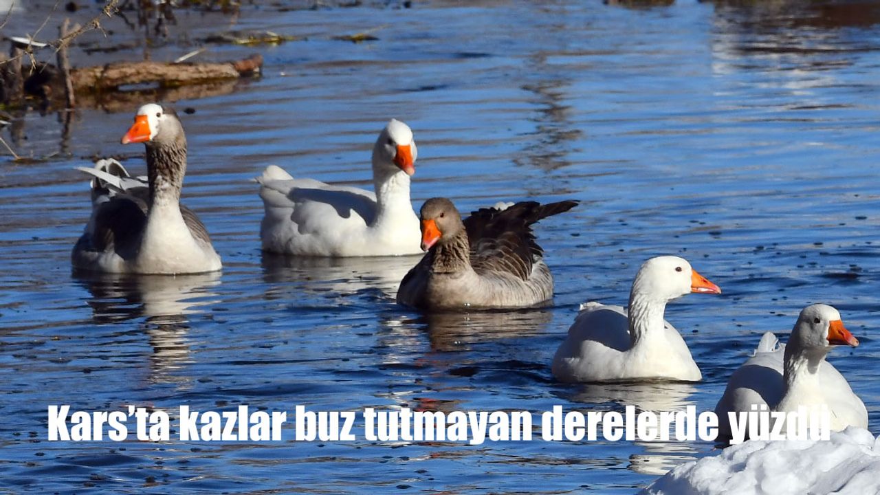Yağbasan köyünde damızlık olarak beslenen kazlar, güneşin açmasıyla köy içinden geçen dereye girerek buz tutmayan kısımda yüzdü.