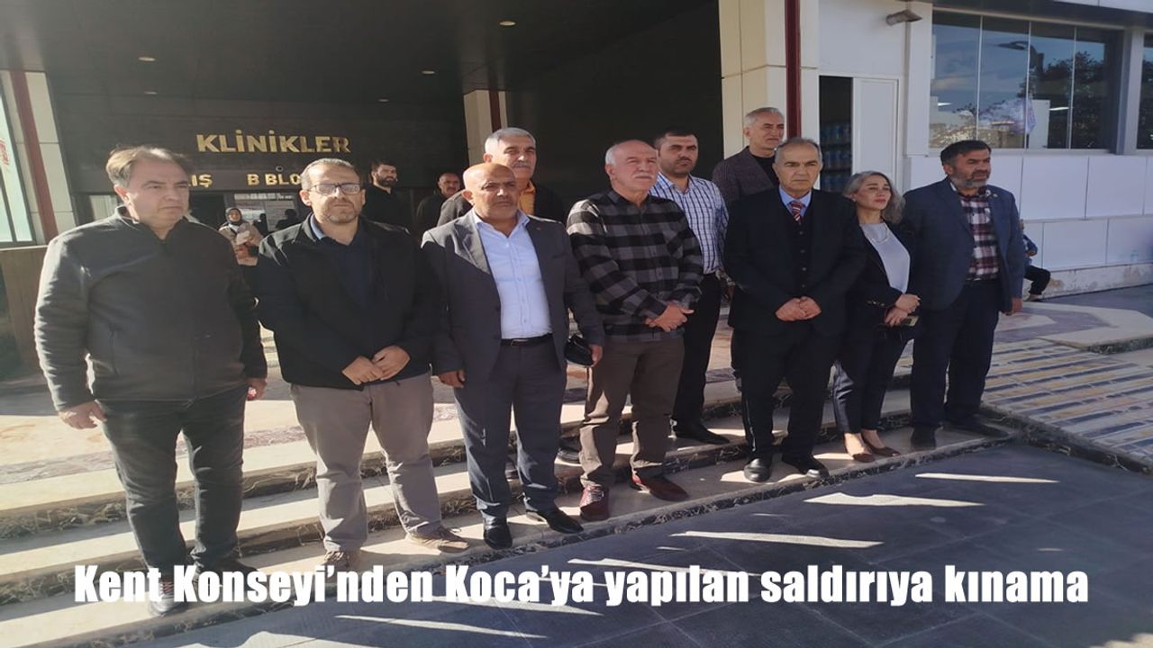 Elazığ Kent Konseyi Yürütme Kurulu Üyeleri, başkan Koca’nın uğradığı silahlı saldırıyı kınamak için Fırat Üniversitesi Hastanesi önünde bir araya geldi. Elazığ Kent Konseyi Yürütme Kurulu Üyesi Suat Kenç burada konsey adına açıklama yaptı.
