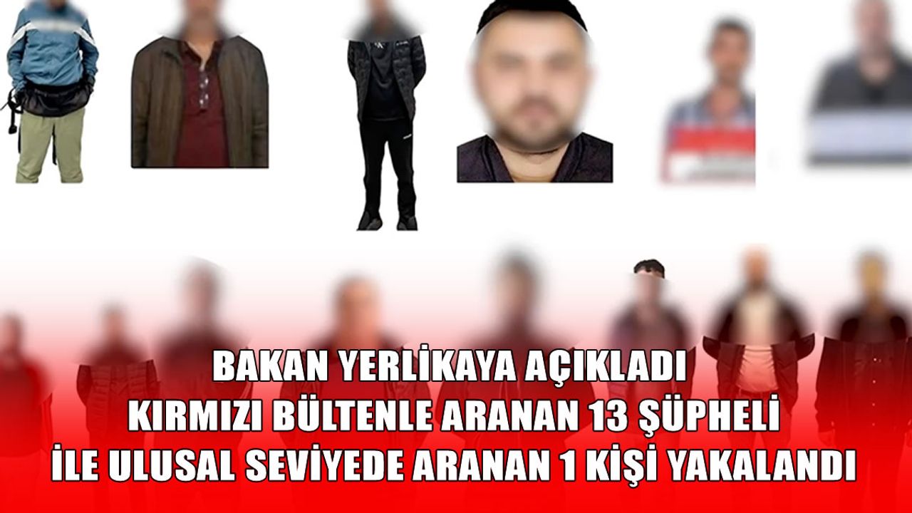 Kırmızı bültenle aranan C.A, S.A, O.R.Y, K.İ, A.A, K.K, M.A, E.K, S.Y, M.A.Y, A.M, D.G. ve H.S.Ç. ile ulusal seviyede aranan C.B'nin Türkiye'ye iadesinin sağlandığını kaydeden Yerlikaya, operasyonların Emniyet Genel Müdürlüğü Interpol-Europol Daire Başkanlığı koordinasyonunda, Adalet Bakanlığı ve polis birimlerinin desteğiyle yürütüldüğünü aktardı.