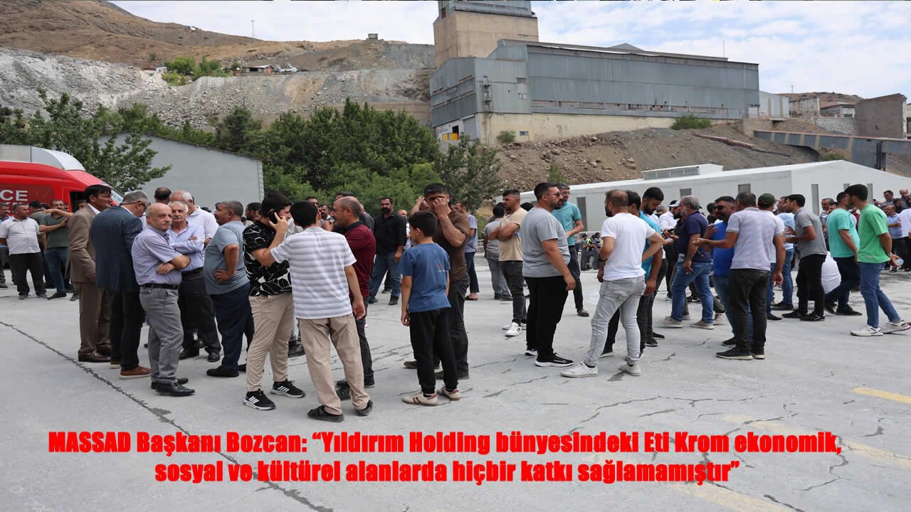 HABER49- Yıldırım Holding bünyesindeki Eti Krom'un ekonomik, sosyal ve kültürel alanlarda hiçbir katkı sağlamadığını dile getiren MASSAD Başkanı Sebahattin Bozcan, "İstihdam alanında da büyük sorunlar yaşanıyor" dedi.