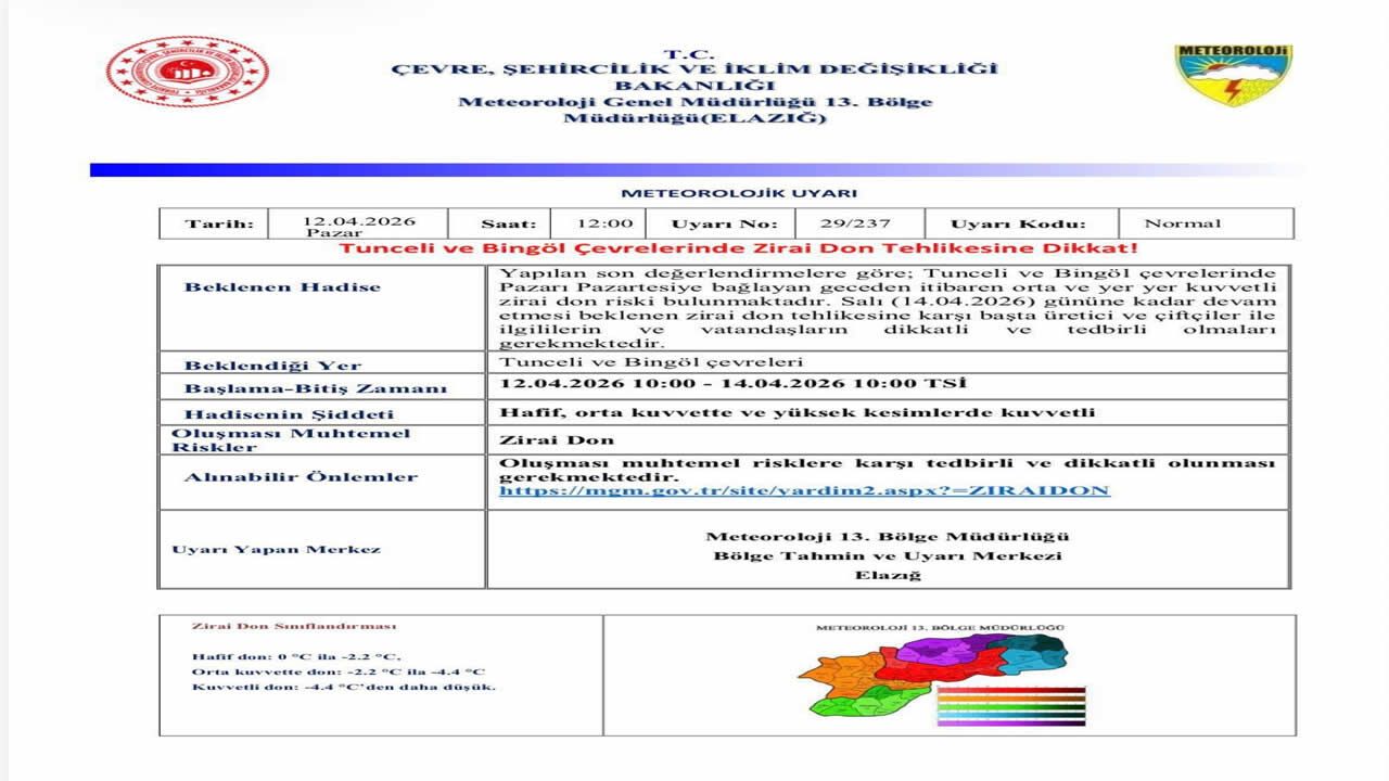 HABER49- Meteoroloji 13’üncü Bölge Müdürlüğü, Bingöl ve Tunceli çevreleri için zirai don uyarısında bulundu.