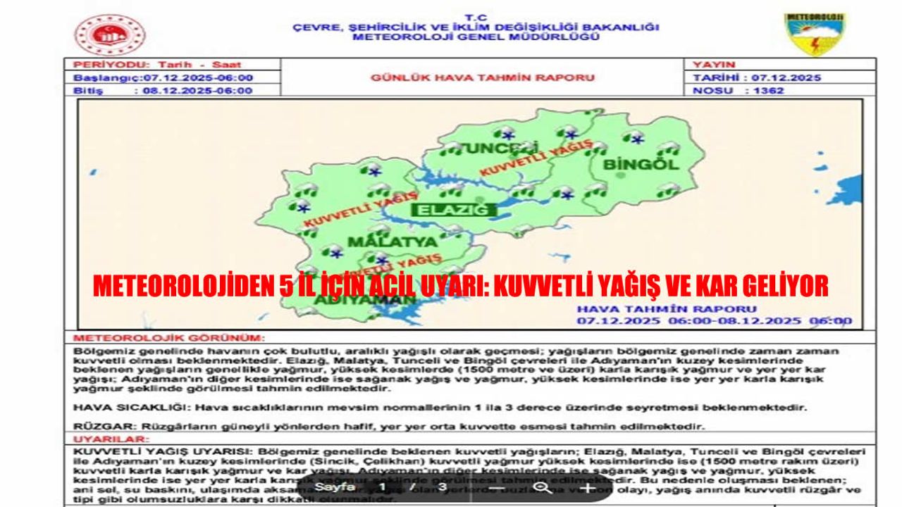 Yapılan açıklamada, özellikle Elazığ, Malatya, Tunceli ve Bingöl çevrelerinde kuvvetli yağmur; 1500 metre üzeri yüksek rakımlarda ise karla karışık yağmur ve yoğun kar yağışı beklendiği bildirildi. Adıyaman’ın kuzeyinde de benzer yağışların etkili olacağı belirtildi.
