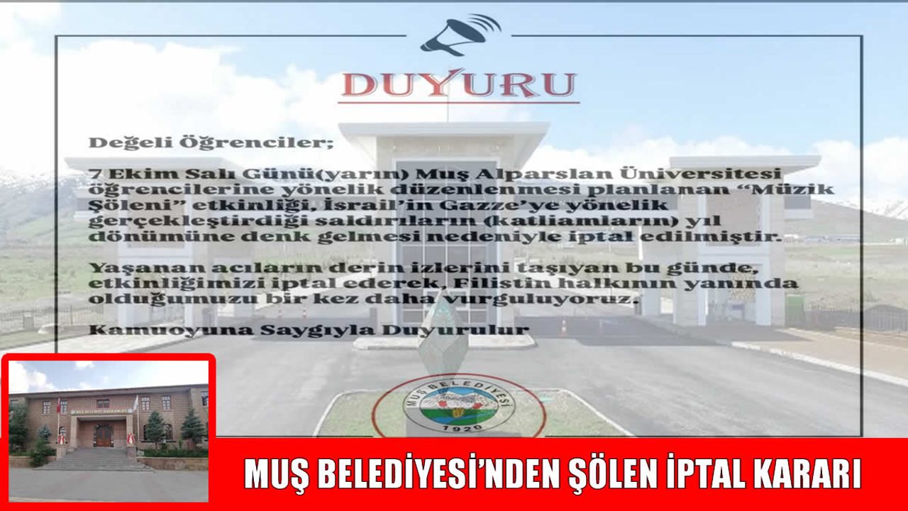 HABER49- Muş Belediyesi, Muş Alparslan Üniversitesi öğrencilerine yönelik yarın düzenlenmesi planlanan “Müzik Şöleni” etkinliğinin iptal edildiğini duyurdu.