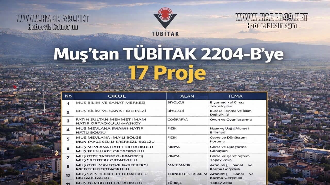 HABER49- TÜBİTAK 2204-B Ortaokul Öğrencileri Araştırma Projeleri Yarışması'nda Van Bölge Sergisi'ne davet edilen projeler açıklandı. Muş, toplam 17 projesiyle bölge etabına damga vurarak bilimsel çalışmalardaki başarısını tescilledi.