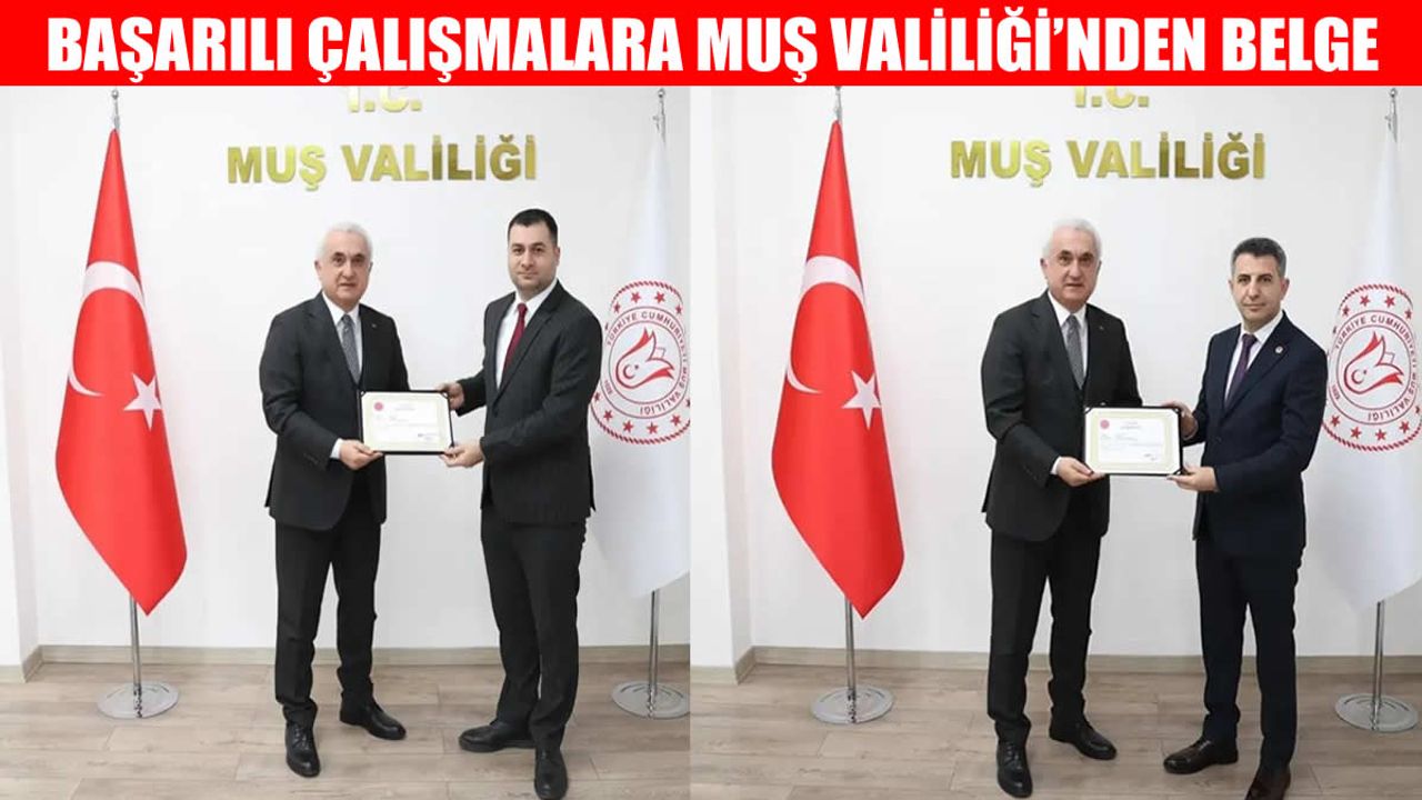 HABER49-Muş Valisi Avni Çakır, il genelinde yürütülen başarılı çalışmalarından dolayı DSİ 172. Muş Şube Müdürü Servet Fırat ile Muş Tarım ve Orman İl Müdürü Necattin Gönç’e başarı belgesi verdi.