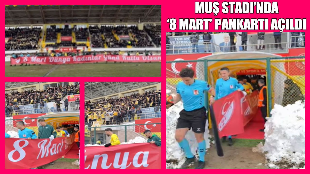 Muş Şehir Stadı’nda oynanan Muşspor-Bursaspor karşılaşmasında oyuncular ve hakemler sahaya “8 Mart Dünya Kadınlar Günü Kutlu Olsun” pankartıyla çıktı.