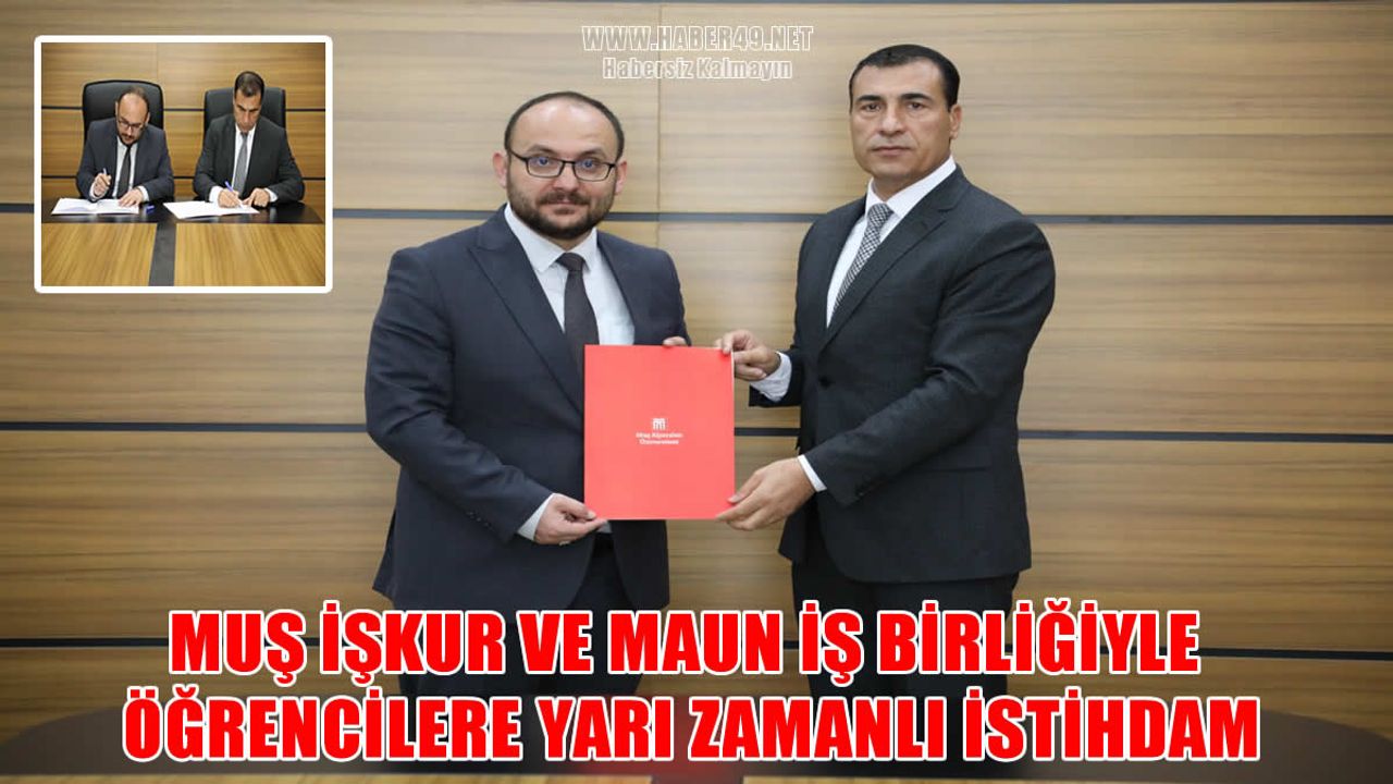 HABER49-Muş Alparslan Üniversitesi (MAUN) ile Türkiye İş Kurumu (İŞKUR) Muş İl Müdürlüğü arasında üniversite öğrencilerine yönelik “İŞKUR Gençlik Programı” çerçevesinde iş birliği protokolü imzalandı. Protokol, Rektör Prof. Dr. Mustafa Alican ve İŞKUR İl Müdürü Ahmet Sağlık tarafından imza altına alındı.