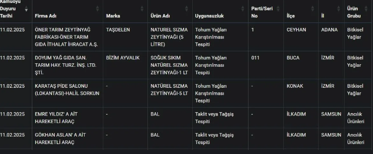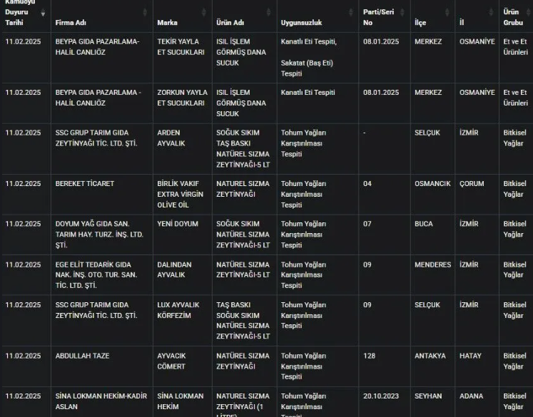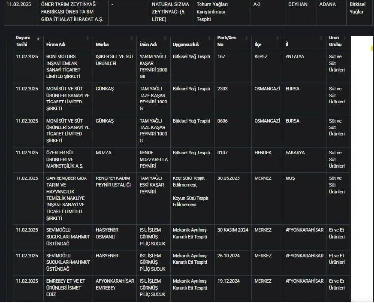 SUCUK, PEYNİR VE ZEYTİNYAĞINDA HİLE!Bakanlığın güncellenen listesinde birçok ildeki firmaların sadece peynir değil, sucuk ve zeytinyağı gibi temel gıdalarda da hile yapıldığı belirlendi. Bazı üreticilerin süte bitkisel yağ karıştırdığı, bazı zeytinyağlarının ise tohum yağlarıyla seyreltilerek tüketiciyi yanılttığı açıklandı.