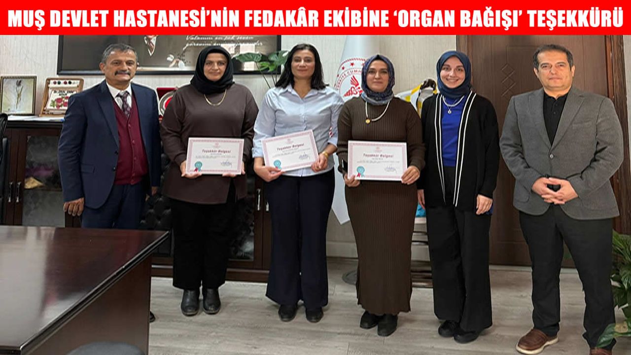 Muş Devlet Hastanesi bünyesinde görev yapan ve kritik süreçleri başarıyla yöneten Organ Bağışı Birimi ekibi, İl Sağlık Müdürü tarafından teşekkür belgesi ile ödüllendirildi.