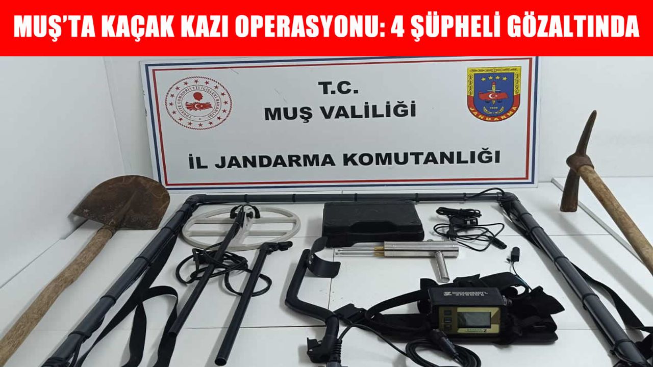 HABER49-Muş İl Jandarma Komutanlığı’na bağlı Mercimekkale Jandarma Karakol Komutanlığı ekipleri, Merkez ilçede kaçak kazı yapıldığı ihbarı üzerine operasyon düzenledi. Bölgeye giden ekipler, kaçak kazı yaptıkları belirlenen K.B., U.B., R.T. ve M.B. isimli şahısları suçüstü yakalayarak gözaltına aldı.